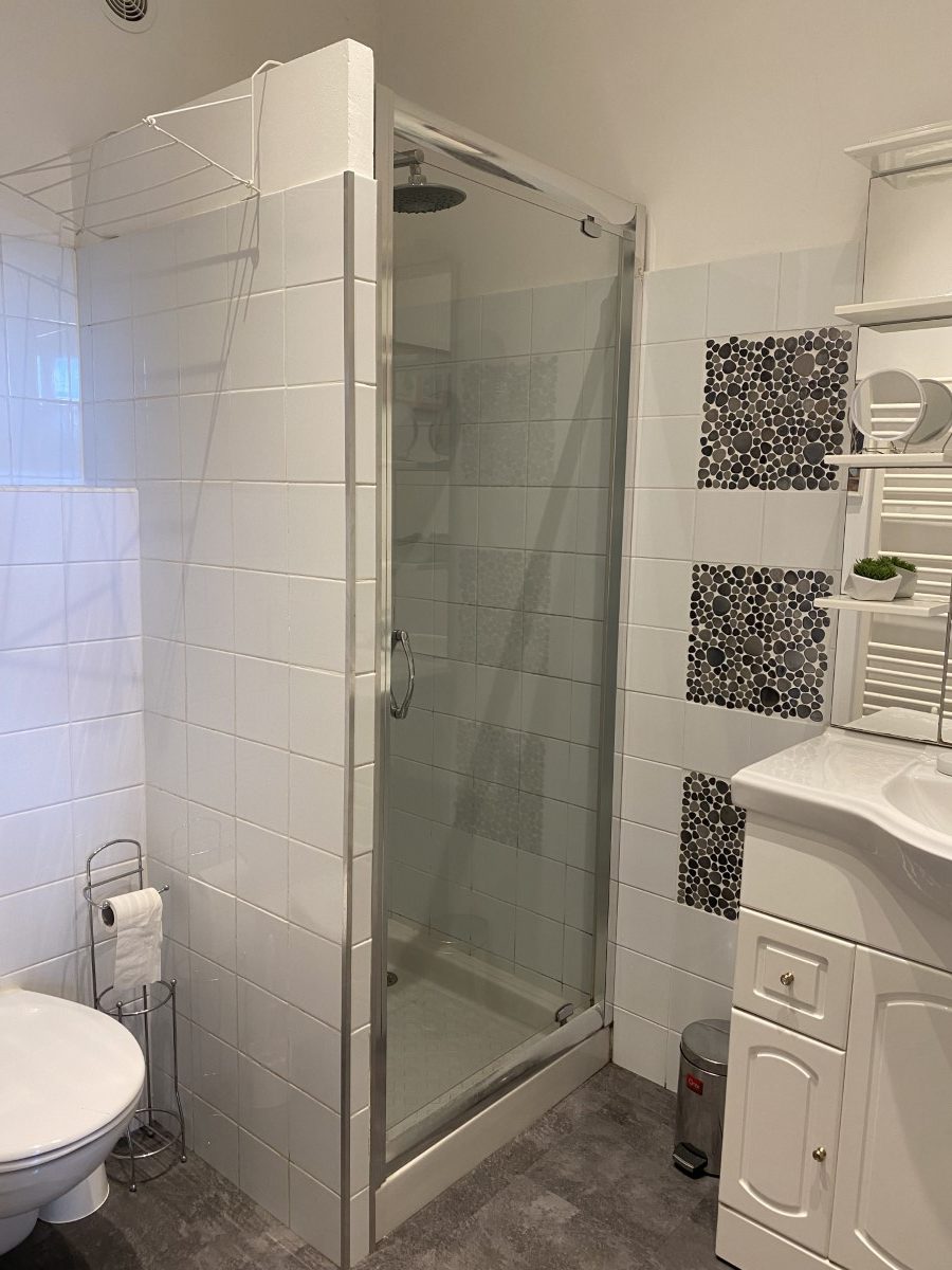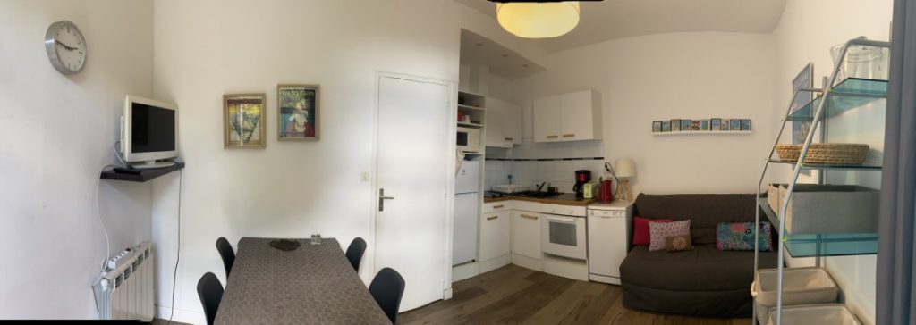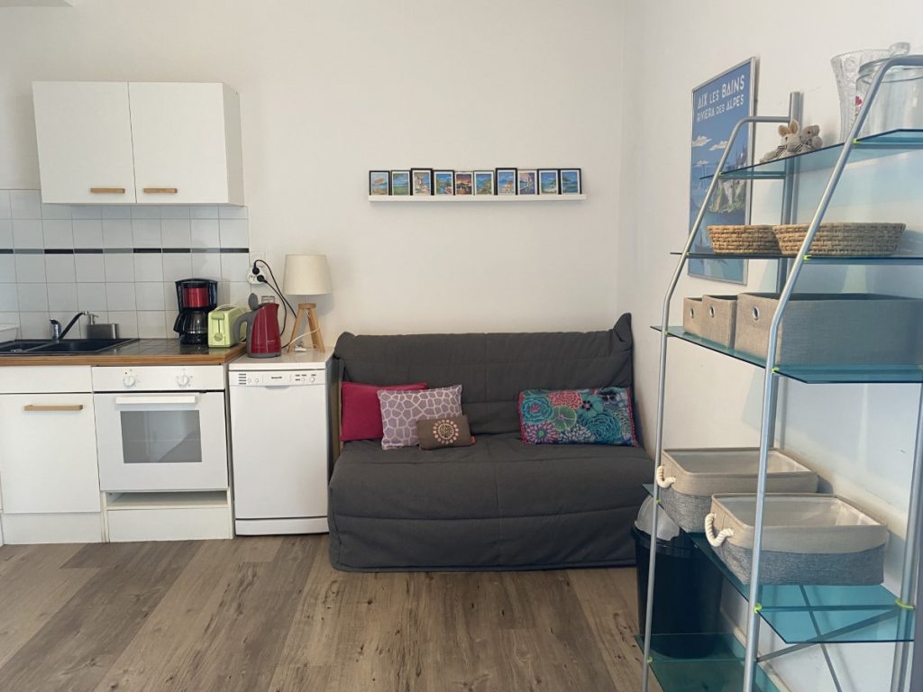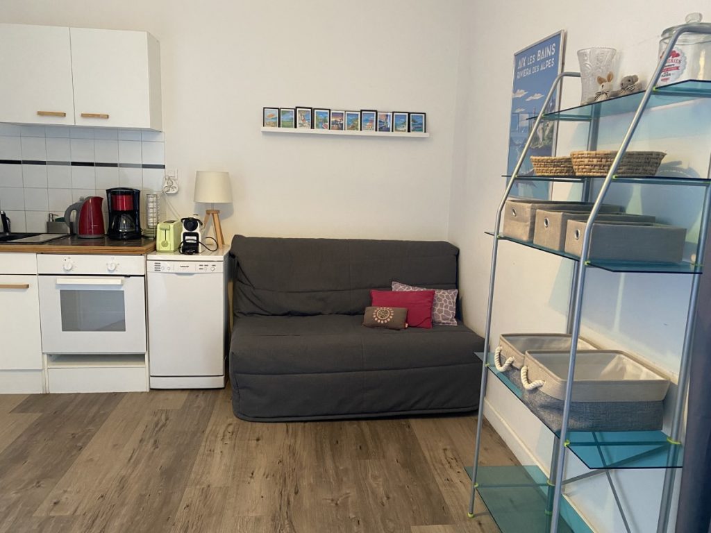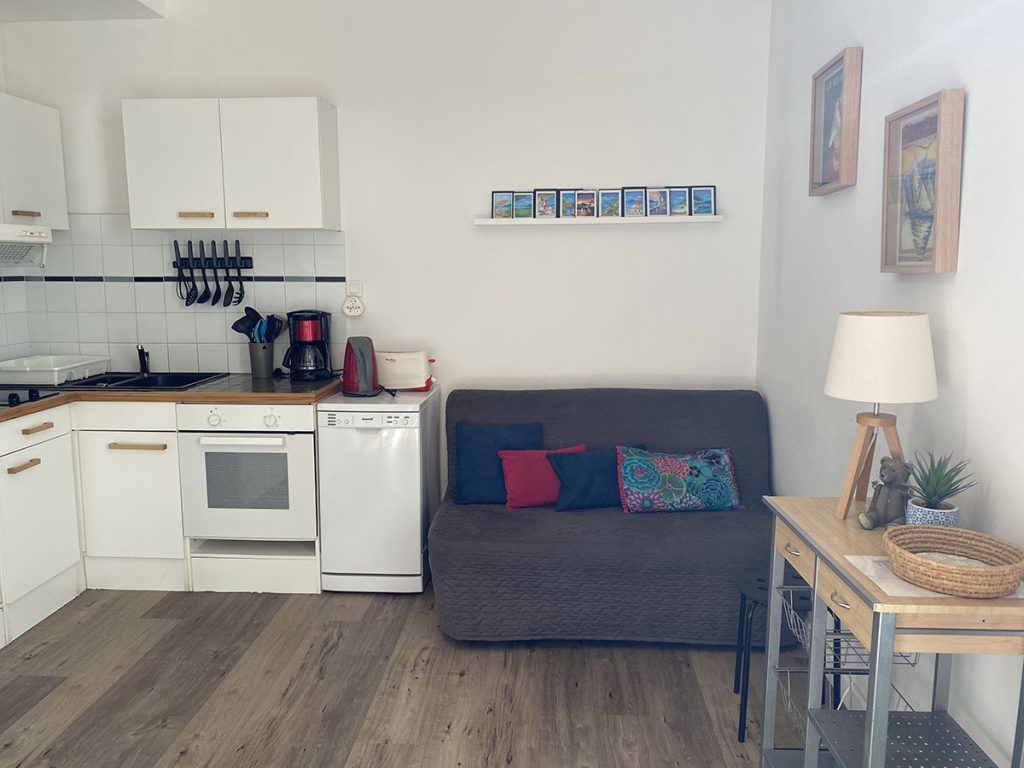 Idéal pour un couple, avec une chambre indépendante, ce studio permet aussi d’accueillir un invité dans l’espace cuisine qui comporte un canapé-lit.