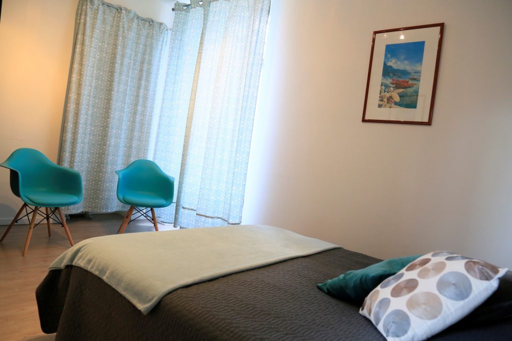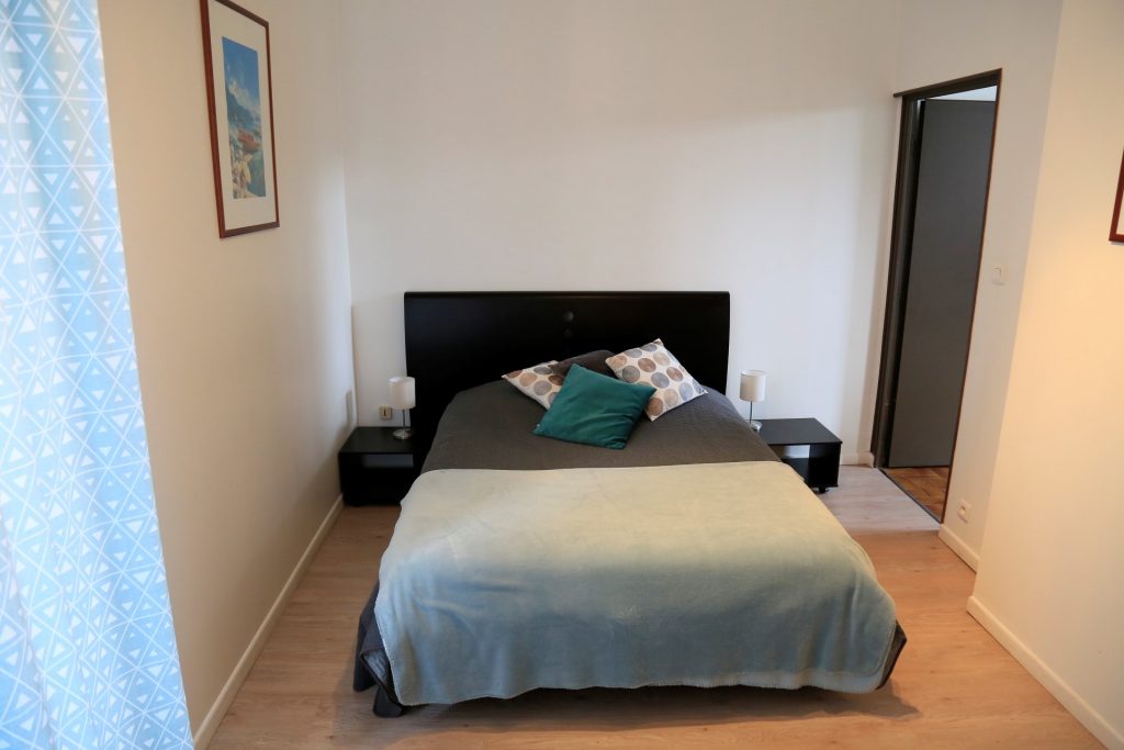 Spacieux, aux harmonies de gris et de turquoise, avec une grande pièce à vivre qui compte une grande table, un canapé et un grand lit de 180 (2 lits de 90 réunis), ce studio de 60 m² peut accueillir 4 personnes avec une chambre séparée.